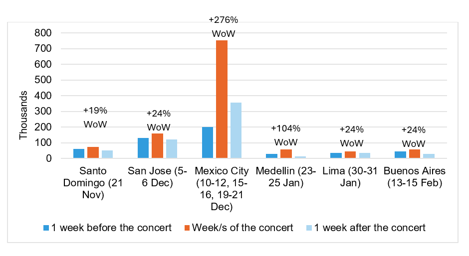 Medellín followed, with +104% growth during its concert dates (23–25 January), underlining the artist’s pull in Colombia. Other cities such as San José, Lima, and Buenos Aires saw moderate increases of around +24%, while Santo Domingo registered a +19% rise, indicating early anticipation in the Caribbean market.