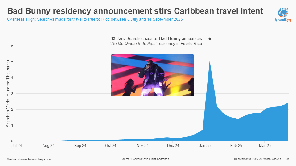 When Bad Bunny announced his No Me Quiero Ir de Aquí residency in Puerto Rico on 13 January 2025, international interest in the island saw a sharp increase. According to ForwardKeys search data, flight searches from overseas markets reached over 510,000 in the week following the announcement — more than seven times the volume of the previous week.